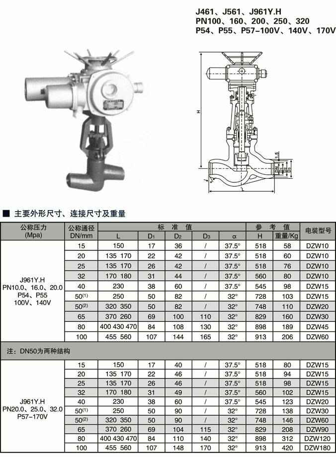 J961H/Y-100 | 10 | 15 | 11 | ≤450 | 水、蒸汽、油品 | |||
